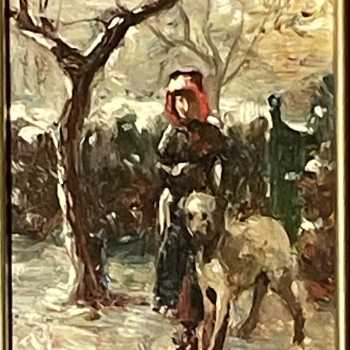 Robert Payton Reid Lady walking Dog Oil on Board Frame: 10” x 6.5” Image: 8.5” x 4.5” Robert Payton Reid (1859-1945) was an Edinburgh-based painter and illustrator. After living in North Queensferry, Fifeshire, Reid returned to Edinburgh to hone his craft at the Royal Scottish Academy schools. From there he traveled to Munich, Germany and Paris, France in the 1880s. A member of the Royal Scottish Academy, Reid traveled extensively through Europe during his career. While renting an art studio in London he became friends with famous Pre-Raphaelite artist John William Waterhouse (1849 – 1917) , who influenced Reid’s style. Upon returning to Scotland, Reid was one of the founders of the Scottish Society of Artists. Reid’s expertise in painting landscapes, and nostalgic country scenes was masterful.
