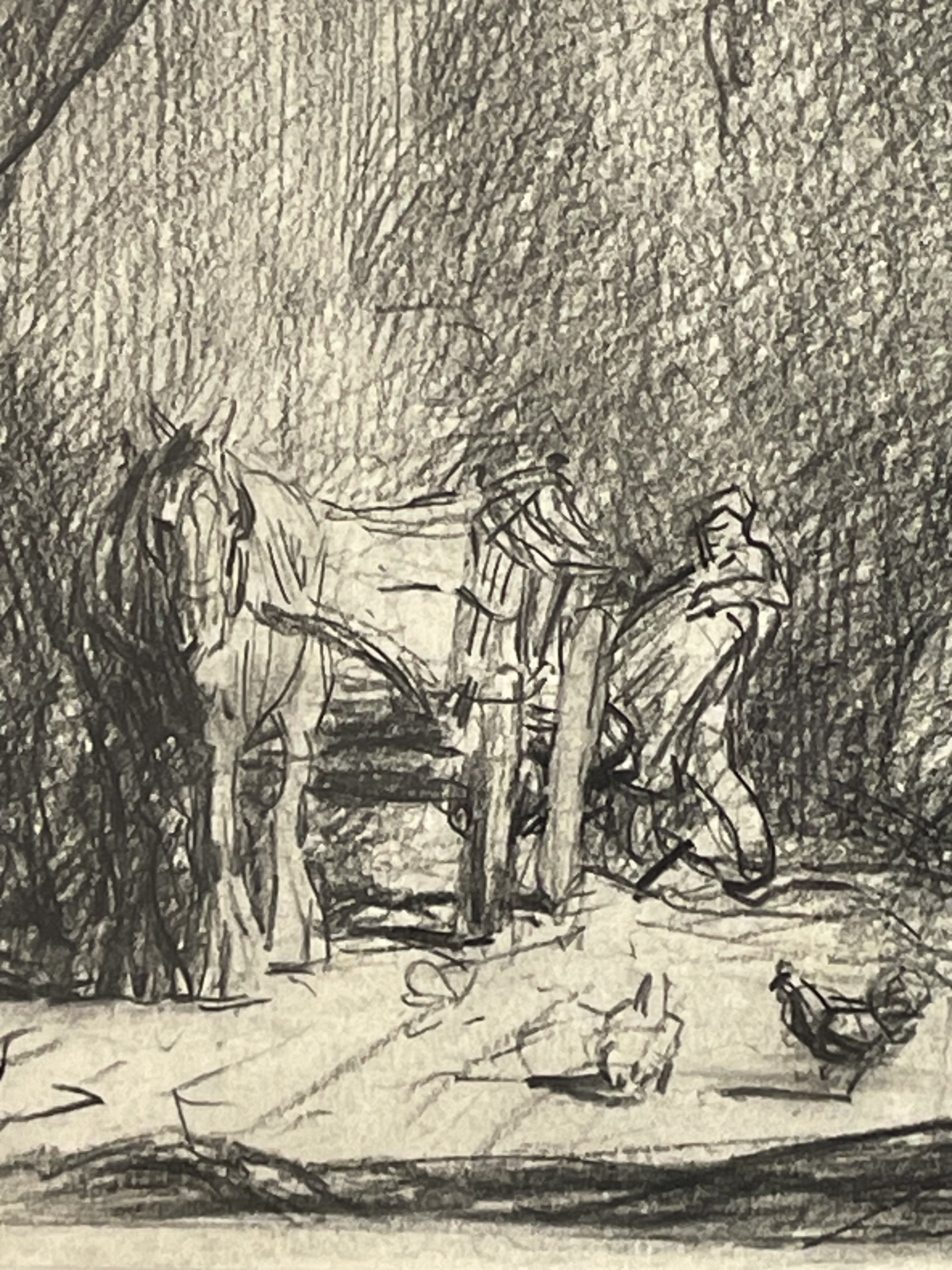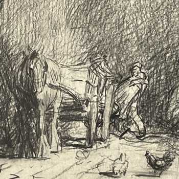 Loading the Cart George Soper Charcoal on wove paper Frame: 17” x 17” Image: 11” x 11” Original drawing by the listed artist and illustrator George Soper (1870 - 1942), created circa 1919. This is the original drawing from which Soper created his lithographic print of that title, which was published in 1919. Chris Beetles Estate Stamp Verso