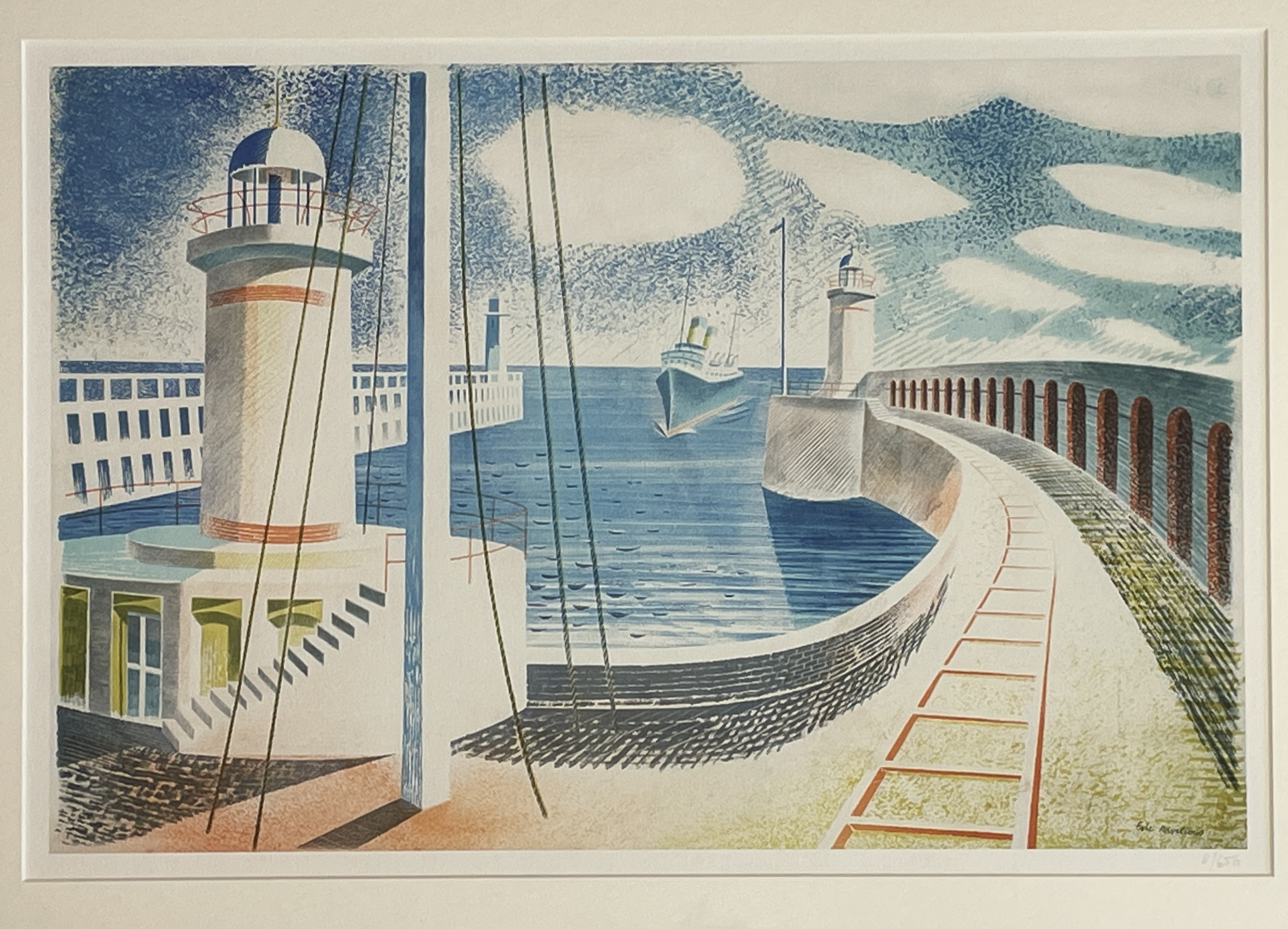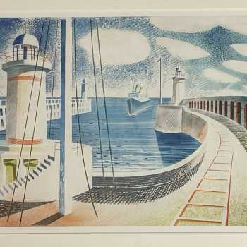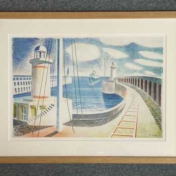 Eric Ravilious Newhaven Harbour Limited Edition Print Frame: 22.5 “ x 28” Print: 14.5” x 20” This is a Giclee Print on Fine Art paper, hand numbered, with a limited edition run of 650. Newhaven Harbour, painted in 1935 to 1936, is one of Ravilious’ most popular watercolours. Ravilious had been staying in Newhaven on the South Coast; he rose early one morning to paint this picture of a cross channel ferry entering the harbour from France.