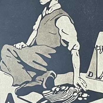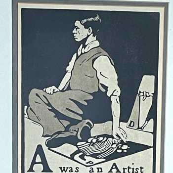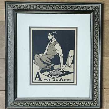 A was an Artist William Nicholson Lithograph from 'An Alphabet'. Frame: 19” x 17” Image: 10” x 8” 'A was an Artist' is a self-portrait. William Nicholson was born at Newark in 1872. He left to study in Paris in his late teens for six months at the Academie Julian before returning to England. In 1893 Nicholson married the painter Mabel Pryde and their first son Ben went on to become the famous painter and sculptor. Nicholson concentrated on printmaking with his brother-in-law James Pryde under the pseudonym of J.& W.Beggarstaff. In 1897 Nicholson made a woodcut of Queen Victoria which established his name with the public. During the same year he worked upon An Illustrated Alphabet for the publisher William Heinemann, important in providing Nicholson with an opportunity to develop his talents as an engraver. He was appointed a Trustee of the Tate Gallery from 1934-39 and knighted in 1936.